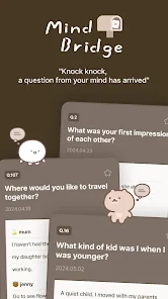مايند بريدج - مايند كيو إيه دايري هو تطبيق مبتكر لنمط الحياة مصمم لمستخدمي أندرويد، يعزز الاكتشاف الذاتي والروابط الأعمق مع الأحباء من خلال أسئلة يومية مؤثرة. يمكن للمستخدمين الانخراط في محادثات ذات مغزى من خلال الاختيار من بين أربعة أنواع من التفاعل: زوجين، عائلة، وحده، أو أصدقاء، كل منها يقدم أسئلة مختارة تشجع على التفكير والنقاش. يحتوي التطبيق أيضًا على ميزة إمكانية وضع إشارة مرجعية على الإجابات الملهمة للرجوع إليها لاحقًا، مما يعزز التجربة العامة للنمو الشخصي والاتصال.